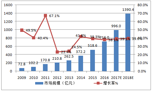 IDC市場是目前對UPS需求最為旺盛的領(lǐng)域之一。據(jù)相關(guān)機(jī)構(gòu)數(shù)據(jù)統(tǒng)計,過去8年國內(nèi)IDC市場復(fù)合增長率達(dá)到42.3%,其中,2009-2011年間IDC市場處于高速增長期,每年增速都維持在40%以上;2012年和2013年受宏觀經(jīng)濟(jì)下滑影響,整體市場增速下降到25%以下;此后,一方面政府加強(qiáng)政策引導(dǎo),逐步開放了IDC牌照申請,另一方面大數(shù)據(jù)、云計算等產(chǎn)業(yè)興起,數(shù)據(jù)中心的市場需求不斷增多。2014年IDC市場增速再次超過40%,2015年市場增速為39.3%,2016年市場增速也達(dá)到了38.1%。據(jù)預(yù)測,今明兩年市場增長率將繼續(xù)在40%左右,明年IDC市場規(guī)模有望接近1400億元,將明顯拉動UPS的需求。