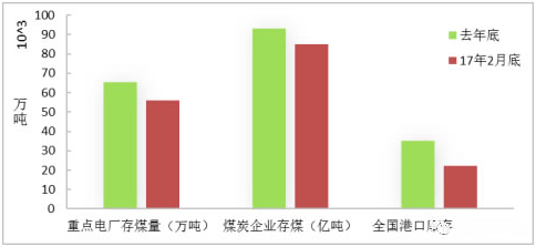 煤炭供應(yīng)略有增加。2017年3月份,原煤產(chǎn)量為3.0億噸,同比增速由負(fù)轉(zhuǎn)正,同比增長1.9%。一季度原煤累計產(chǎn)量8.1億噸,同比下降0.3%;煤炭凈進(jìn)口6225.8萬噸,同比增加1658.1萬噸。1~2月份煤炭企業(yè)、重要電廠、港口煤炭庫存與2016年年底相比皆有回落。