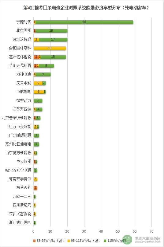 筆者根據(jù)本次217款非快充類(lèi)純電動(dòng)客車(chē)的電池能量密度,對(duì)電池企業(yè)進(jìn)行如下排名: