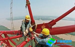工作人員在錦蘇線長(zhǎng)江大跨越鐵塔上進(jìn)行高空鐵塔組立。