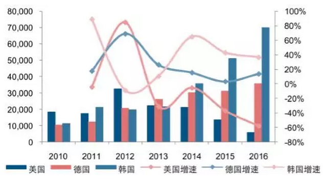 根據(jù)數(shù)據(jù),2016 年我國多晶硅進口 14.1 萬噸,同比增長 25.67%,進口規(guī)模占總消費量的 40%以上。其中,從韓國進口 7.01 萬噸,同比增長 36.92%;從德國進口 3.57萬噸,同比增長 14.01%。從美國進口 0.56 萬噸,同比減少 56.76%。