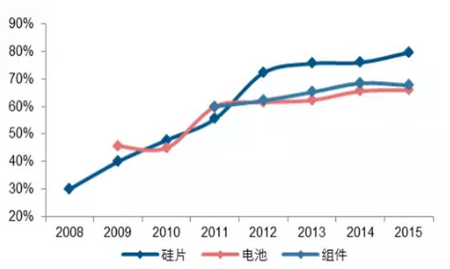 2015 年我國硅片、電池、組件環(huán)節(jié)產能均占全球 70%以上