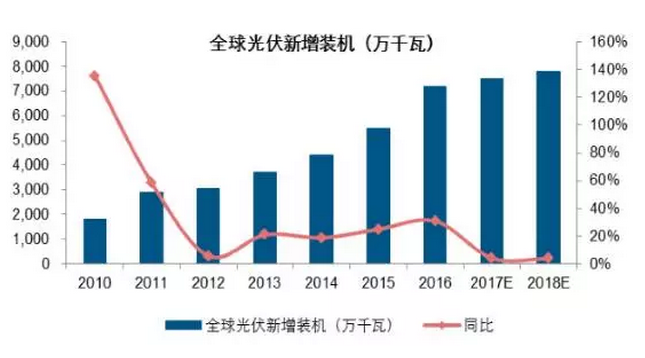 預計2017-2018 年全球光伏裝機將維持穩(wěn)態(tài)發(fā)展,年化增速在 5%左右