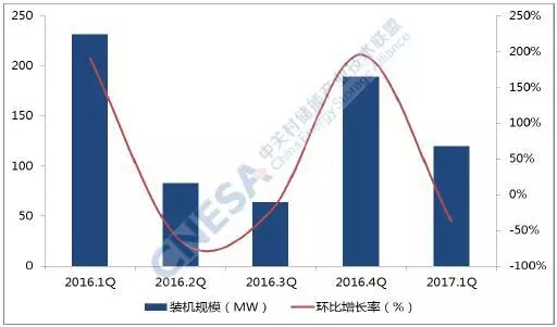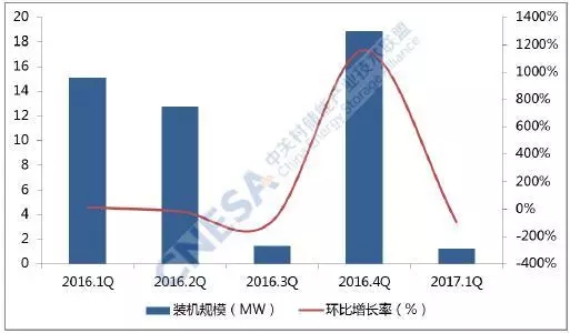 圖4 連續(xù)五個(gè)季度新增投運(yùn)項(xiàng)目的裝機(jī)分布及環(huán)比增長率(中國)