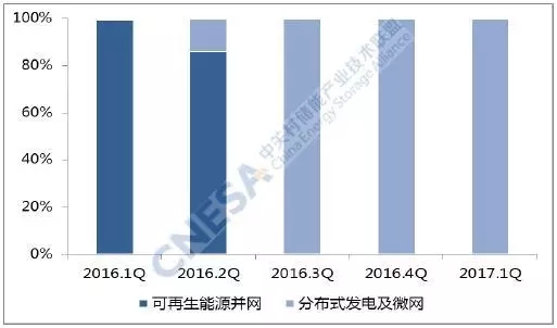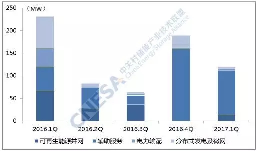 從應(yīng)用分布上看,投運(yùn)項(xiàng)目在輔助服務(wù)領(lǐng)域的裝機(jī)規(guī)模最大,為99.1MW,同比增長87%,環(huán)比2016年四季度下降38%。