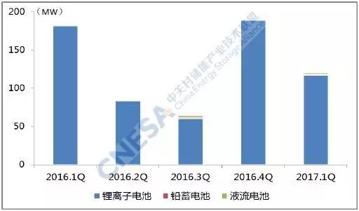 從技術(shù)分布上看,投運(yùn)項(xiàng)目中,鋰離子電池的裝機(jī)規(guī)模最大,為117.1MW,同比下降35%,環(huán)比2016年四季度下降38%。