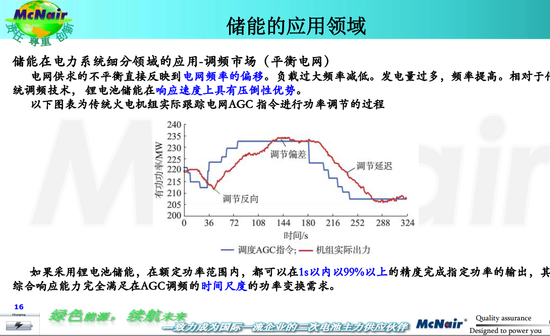 在調(diào)頻市場主要是作為平衡電網(wǎng)。電網(wǎng)供需的不平衡直接反映到電網(wǎng)頻率的偏移上,負荷過大的時候頻率減低,發(fā)電量過多,頻率提高。相對于傳統(tǒng)調(diào)頻技術(shù),鋰電池儲能在響應速度上具有壓倒性優(yōu)勢。