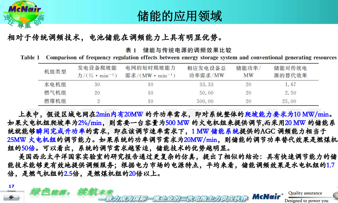 對于傳統(tǒng)的調(diào)頻技術(shù),電池儲能系統(tǒng)在調(diào)頻能力上具有明顯的優(yōu)勢。以這個表為基礎,假設這個區(qū)域的電網(wǎng)需要在2分鐘內(nèi)有20MW的功率提升,對系統(tǒng)的爬坡能力是在10MW每分鐘,如果火力機組的爬坡效率是2%每分鐘,則需要配備一個500MW的火電機組來滿足這個需求,如果采用20兆瓦的儲能系統(tǒng),瞬間就可以完成功率提升需求。在調(diào)節(jié)速率的需求下,1MW的儲能系統(tǒng)提供的AGC調(diào)頻能力相當于是25MW的火力發(fā)電機組的調(diào)頻能力。如果我們的功率調(diào)節(jié)需求提升到20MW每分鐘的情況下,儲能的調(diào)頻替代效果相當于火力發(fā)電機組的50倍。