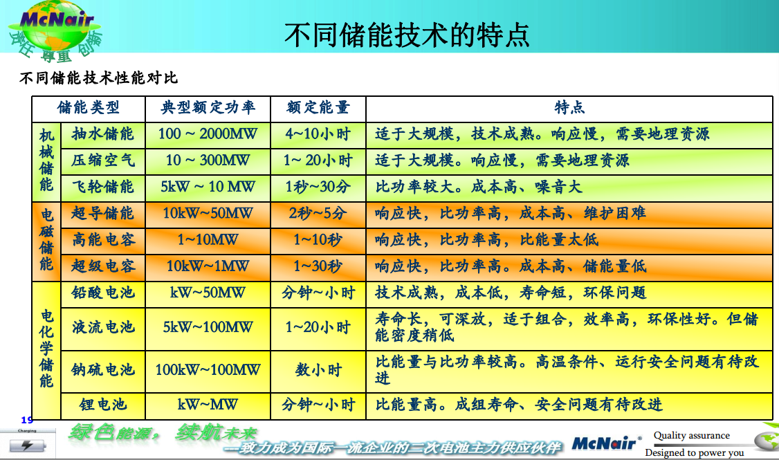 在電化學儲能這邊,鉛酸電池這塊技術(shù)是最成熟的,但是它帶來的最主要問題還是環(huán)保問題。液流電池的壽命長,可深放,適于組合,效果高,環(huán)保性好,但是儲能密度稍低。對于鈉硫系統(tǒng)來說,比能量和比功率比較高,高溫條件、運行安全問題有待改善。對于鋰電池來說,它的比能量比較高,成組壽命和安全問題還是有待改善。