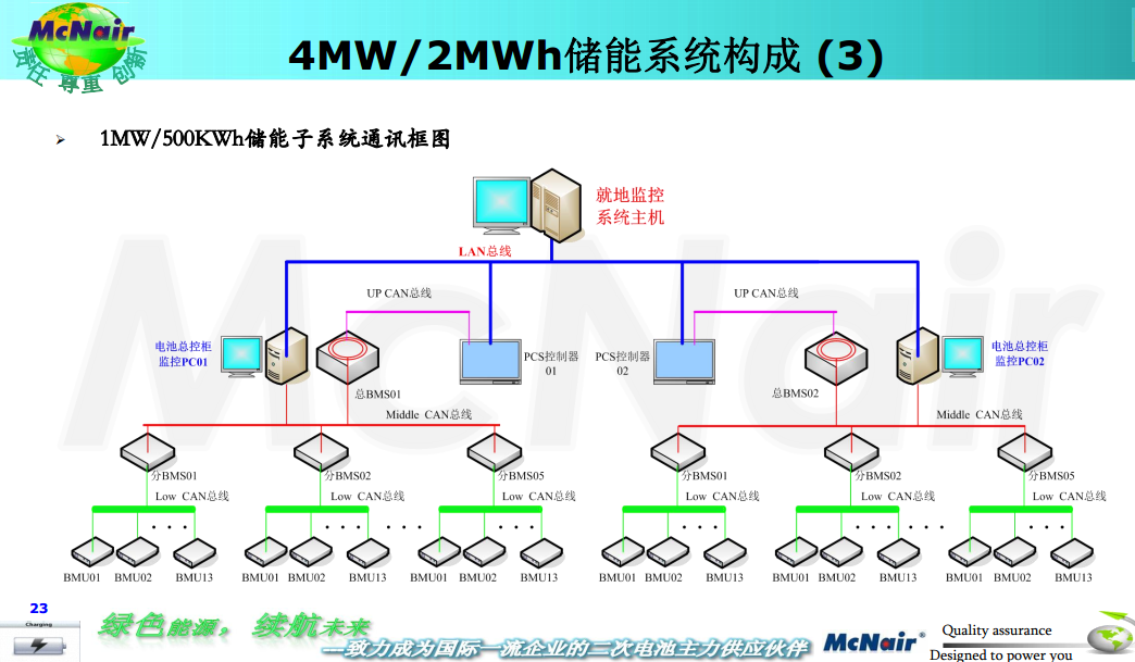 這個是系統(tǒng)的通訊拓撲圖,對于儲能來說,大堆棧的系統(tǒng)整合,一般情況下采用的是三級架構(gòu)的管理系統(tǒng),最底層的BMU,負責剛剛提到的最小的子單元的管理。它的中間層是分BMS,一個分BMS管理13個BMU,然后由主BMS管理5個這樣的分BMS,也就是5臺電池柜形成了一個最小子單位的電池系統(tǒng),然后有兩套這樣的電池系統(tǒng)整合在一起,形成了1MW/500kWh儲能子系統(tǒng)。