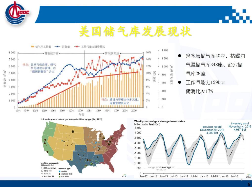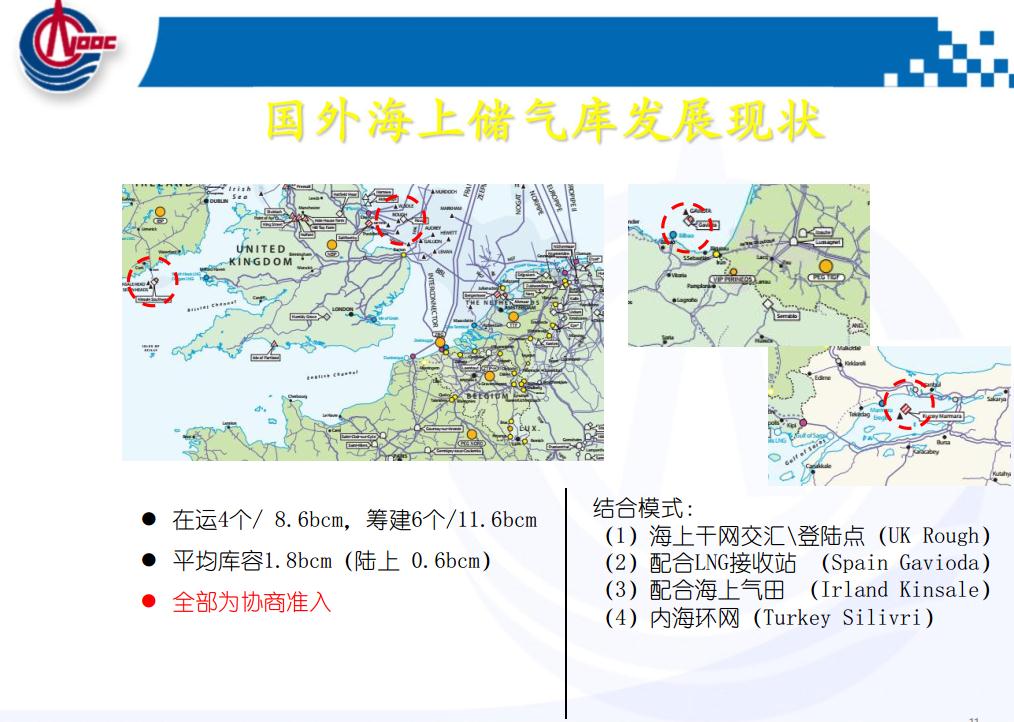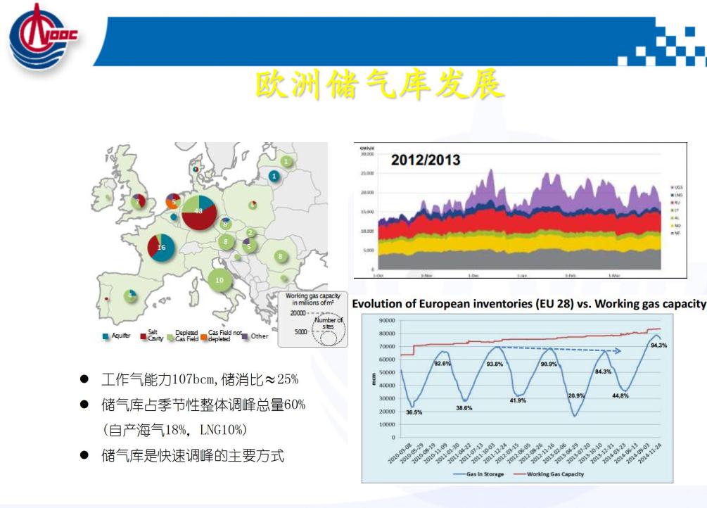 這是歐洲儲氣庫的運行特性,冬天滿足采暖,整個歐洲靠天然氣,雖然歐洲的可再生能源發(fā)展很好,但是它的調峰目前還是以天然氣為主。這是它的運行機制,包括歐洲和美國的天然氣價格是放開的,求大于供就漲價了,供大于求就降價了。便宜的時候美國四五毛錢一方氣,用不了就存起來,到了冬天天氣很冷的時候,賣到三四塊錢完全有可能,這套體系儲氣庫和管道,包括電網(wǎng)都可以實現(xiàn)盈利,但是價格要放開。這是其他國家的一些海上儲氣庫,因為我們海油主要是從海上的老氣田轉儲氣庫?,F(xiàn)在的管道都聯(lián)同了,可以互相互聯(lián)相互串氣。到了冬天如果華北、東北、西北需要采暖的時候,我們和他簽增量合同,完全可以解決。