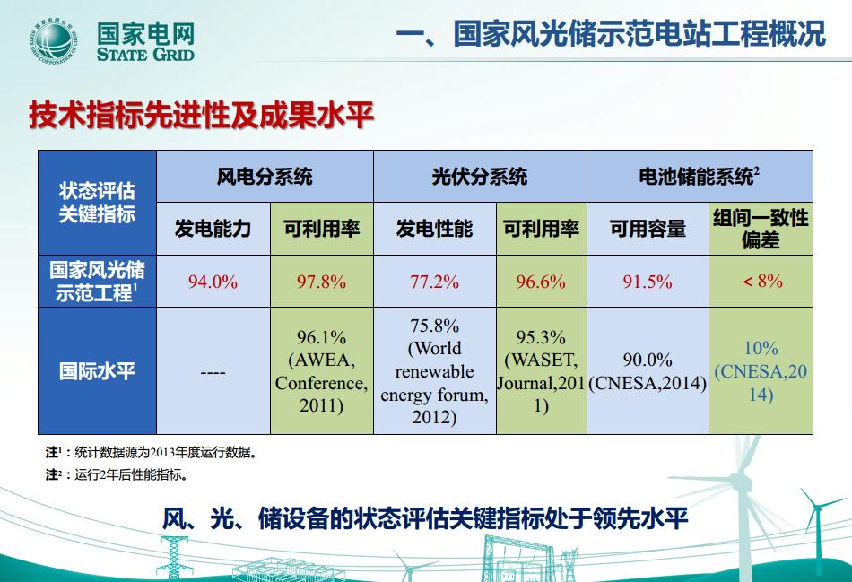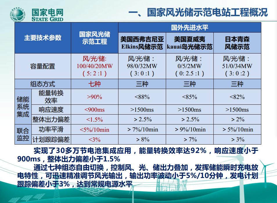 我們作為一個省級電科院,我們對風(fēng)光儲進行了定期的測試,這是列出的是我們對風(fēng)光儲示范電站儲能系統(tǒng)某次測試的結(jié)果,它實現(xiàn)了30多萬節(jié)電池的集成應(yīng)用,能量轉(zhuǎn)換效率達到了92%,響應(yīng)速度小于900毫秒,整體出力偏差小于1.5%,而且它設(shè)計的組態(tài)方式就是風(fēng)、光、儲的出力疊加的方式達到了7種,發(fā)揮了儲能系統(tǒng)損失充放電的特性,可以迅速的調(diào)節(jié)風(fēng)光的出力波動,輸出功率波動小于5%/10分鐘,發(fā)電計劃的跟蹤偏差小于3%,基本達到了常規(guī)電源的水平,我們也在這邊列舉了一些國外的先進水平,相比之下風(fēng)光儲示范電站儲能性能還是比較優(yōu)秀的。