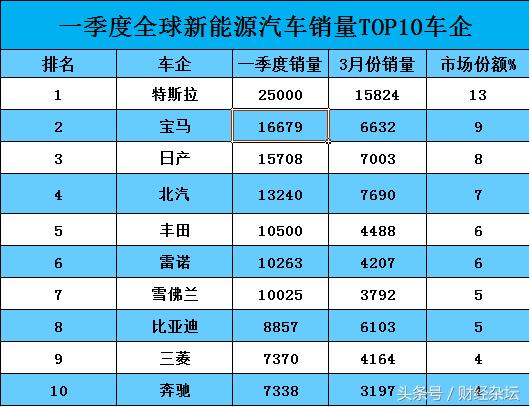 值得一提的是,在全球排名方面,根據(jù)EV SALES BLO的數(shù)據(jù),一季度特斯拉以25000輛銷量奪得冠軍,寶馬、日產(chǎn)分別以16679輛、15708輛排名第二和第三,而去年還無緣前十名的豐田則躍至第五。