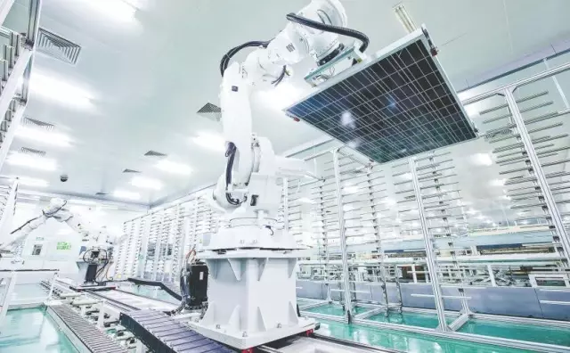 原材料價(jià)格逐漸走低,加上“領(lǐng)跑者”高效技術(shù)的應(yīng)運(yùn)用,使得光伏企業(yè)更要多依靠“真功夫”和“硬本事”。晶科能源開(kāi)啟“智能”制造體系以來(lái),自動(dòng)化生產(chǎn)率達(dá)到80%以上,有效地降低了人力成本。圖為機(jī)器人正在將固化好邊框的太陽(yáng)能電池板放進(jìn)傳送帶,送進(jìn)終檢區(qū)。(晶科能源供圖)