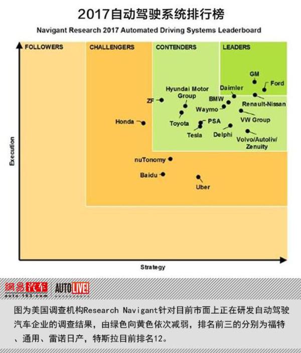 調(diào)查范圍為目前自動(dòng)駕駛方面領(lǐng)先的18家廠商,包括特斯拉,評(píng)定結(jié)果為,它們之間的差距其實(shí)很小,排名前三的分別為福特、通用、雷諾日產(chǎn),特斯拉目前排名12.