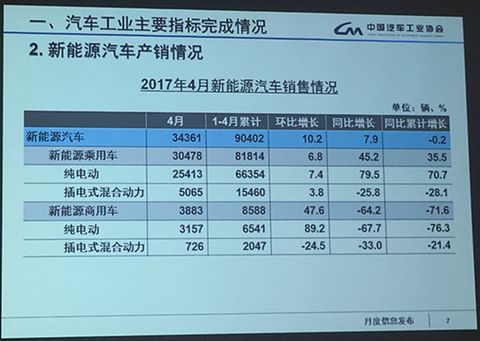 4月份,新能源乘用車的產(chǎn)量為33717輛,其中純電動乘用車27086輛、插電式混合動力乘用車6631輛,新能源商用車為產(chǎn)量3589輛,其中純電動商用車3111輛,插電式混合動力商用車477輛。1-4月,新能源乘用車累計產(chǎn)量85478輛,新能源商用車累計產(chǎn)量10378輛。