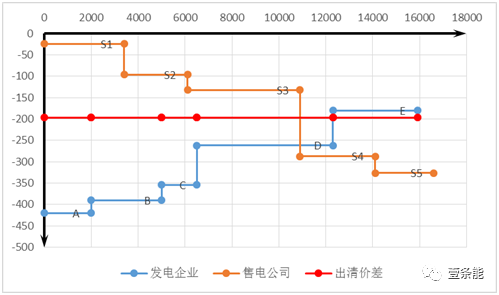 下圖給出了一個(gè)交易示例,中間紅色的橫線表示統(tǒng)一出清價(jià)格,而橙色和藍(lán)色的階梯形線分別代表買家(電力用戶和售電公司)和賣家(發(fā)電企業(yè))的報(bào)價(jià)??梢钥吹劫I家S1和賣家A的價(jià)差對(duì)最大,是最優(yōu)先成交的,但他們的報(bào)價(jià)離統(tǒng)一出清價(jià)是最遠(yuǎn)的。而買家S3和賣家D的價(jià)差對(duì)最小,是最后成交,但他們的報(bào)價(jià)離統(tǒng)一出清價(jià)是最近的。至少為什么是價(jià)差對(duì)大的優(yōu)先成交,也是因?yàn)橘I家出價(jià)越高,賣家出價(jià)越低,他們之間達(dá)成交易的凈收益才越大。按照價(jià)差對(duì)大小進(jìn)行排列,本身就是將出價(jià)最高的買家與出價(jià)最低的賣家進(jìn)行匹配,這也是市場(chǎng)機(jī)制實(shí)現(xiàn)最有效率交易的體現(xiàn)。而安徽交易規(guī)則中按照與統(tǒng)一出清價(jià)接近程度依次進(jìn)行匹配,在理論上則會(huì)出現(xiàn)買家S4和賣家D比買家S1和賣家A優(yōu)先匹配成交的結(jié)果,而此時(shí)他們之間的價(jià)差為負(fù),也就是賣家出價(jià)比買家還高,這在現(xiàn)實(shí)中是不可能達(dá)成交易的。