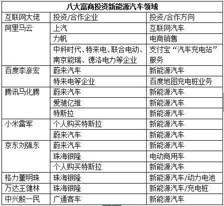 正是看到了這個巨大“蛋糕”,阿里馬云、百度李彥宏、騰訊馬化騰、小米雷軍、京東劉強東、格力董明珠、萬達王健林、中興殷一民等八大富商紛紛投資了新能源汽車相關領域。