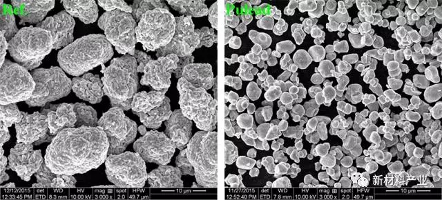 北大先行科技產(chǎn)業(yè)有限公司(以下簡(jiǎn)稱“北大先行”)從調(diào)整材料晶粒尺寸入手,開(kāi)發(fā)高安全性動(dòng)力三元材料,并取得可喜進(jìn)展。圖2(a)是目前市面常見(jiàn)的團(tuán)聚體形貌三元正極材料,圖2(b)則是該公司通過(guò)調(diào)整晶粒尺寸、控制顆粒形貌開(kāi)發(fā)的新型三元正極材料。