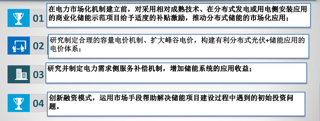 從推動(dòng)儲(chǔ)能技術(shù)商業(yè)化方面,我們給了一些相關(guān)建議。雖然國(guó)家能源局和發(fā)改委,從報(bào)告上面作出了一系列的支持政策,但是儲(chǔ)能都是包含在各項(xiàng)規(guī)劃政策當(dāng)中,沒有具體單獨(dú)性的政策。儲(chǔ)能的補(bǔ)貼政策沒有落地,所以我們認(rèn)為要借鑒一些國(guó)際經(jīng)驗(yàn),同時(shí)也要符合我們國(guó)家國(guó)情,來做一個(gè)適合推動(dòng)儲(chǔ)能產(chǎn)業(yè)發(fā)展的相關(guān)政策建議。