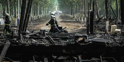 5月2日,經(jīng)濟(jì)觀察報記者趕往蟹島時,火災(zāi)現(xiàn)場已經(jīng)被嚴(yán)密封鎖。根據(jù)附近多位居民的說法,5月1日的火災(zāi)很嚴(yán)重,幾公里外可以看見數(shù)十米高沖天的黑煙,中間還伴隨著巨大的爆炸聲,雖然大火在兩個小時內(nèi)得到控制,但是消防車輛直至下午4點還在不斷灑水。從一些目擊者拍攝的現(xiàn)場視頻資料來看,火勢幾乎在幾分鐘內(nèi)就變得不可控制,近三十輛車很快被燒得只剩下車架。
