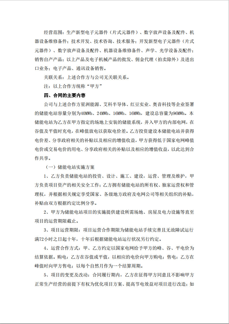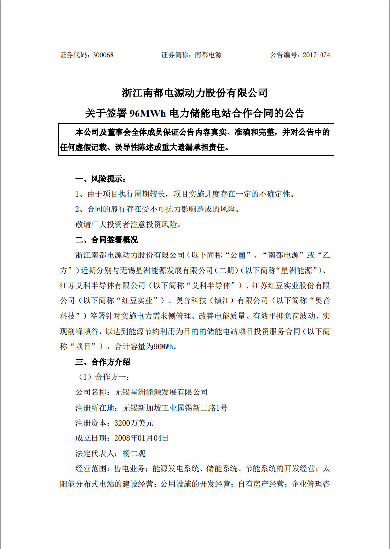 2017年5月18日公告,公司近期分別與無(wú)錫星洲能源發(fā)展有限公司(二期)(以下簡(jiǎn)稱“星洲能源”)、江蘇艾科半導(dǎo)體有限公司(以下簡(jiǎn)稱“艾科半導(dǎo)體”)、江蘇紅豆實(shí)業(yè)股份有限公司(以下簡(jiǎn)稱“紅豆實(shí)業(yè)”)、奧音科技(鎮(zhèn)江)有限公司(以下簡(jiǎn)稱“奧音科技”)簽署針對(duì)實(shí)施電力需求側(cè)管理、改善電能質(zhì)量、有效平抑負(fù)荷波動(dòng)、實(shí)現(xiàn)削峰填谷,以達(dá)到能源節(jié)約利用為目的的儲(chǔ)能電站項(xiàng)目投資服務(wù)合同(以下簡(jiǎn)稱“項(xiàng)目”),合計(jì)容量為96MWh,總投資約12,500萬(wàn)元。
