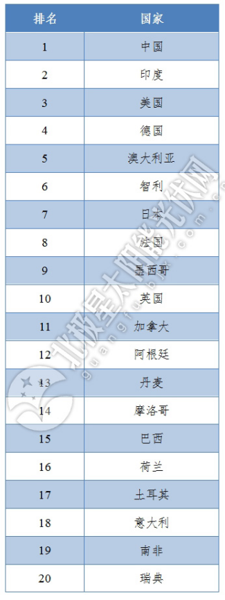 在RECAI排名中,印度排名第二,穩(wěn)步上升。到2020年印度可再生能源發(fā)電目標(biāo)為175GW,其中100GW為光伏發(fā)電。過(guò)去三年中,該國(guó)已經(jīng)安裝了超過(guò)10GW的太陽(yáng)能發(fā)電。