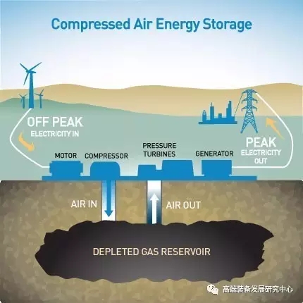 壓縮空氣蓄能是利用電力系統(tǒng)負荷低谷時的剩余電量,由電動機帶動空氣壓縮機,將空氣壓入作為儲氣室的密閉大容量地下洞穴,當系統(tǒng)發(fā)電量不足時,將壓縮空氣經(jīng)換熱器與油或天然氣混合燃燒,導入燃氣輪機作功發(fā)電。