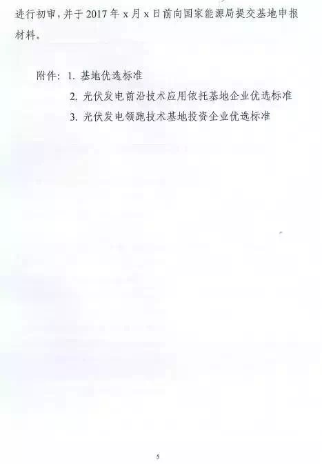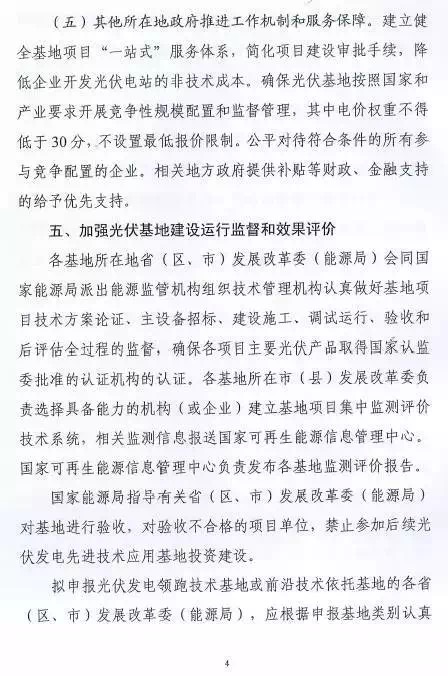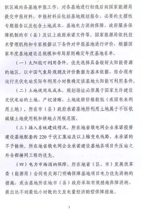 每個(gè)省(區(qū)、縣)可申報(bào)3個(gè)基地,總規(guī)模不超過(guò)2G瓦。2016年光伏發(fā)電未達(dá)到最低保障小時(shí)數(shù)的?。▍^(qū)、縣)不得申請(qǐng)。已建成未驗(yàn)收以及在建基地所在市(縣)級(jí)區(qū)域不安排新建基地。