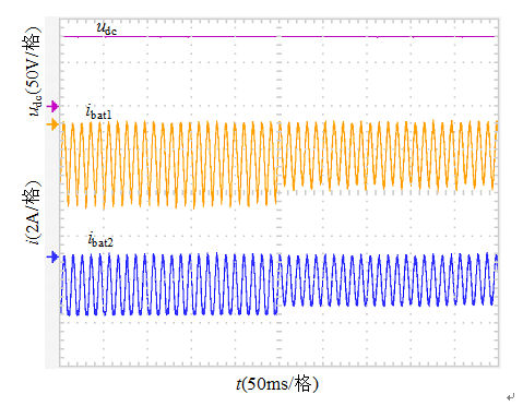從圖12可知,通過ESU的穩(wěn)壓控制,PSU公共直流側(cè)母線電壓基本上保持為直線,表明了ESU對公共直流側(cè)母線電壓的穩(wěn)壓效果顯著,可有效的抑制混合微電網(wǎng)能量的波動。此外,從圖12中還可以看出,充電電流iL,Bat1要大于iL,Bat2,這是因為儲能電池Bat1的SOC大于儲能電池Bat2的SOC,實驗結(jié)果和分析結(jié)果一致,驗證了ESU能量協(xié)調(diào)控制方法的有效性。