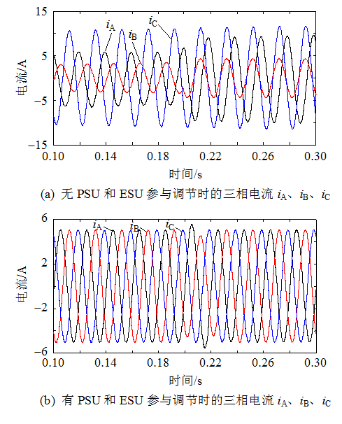 圖7有無PSU和ESU參與調(diào)節(jié)的三相電流iA、iB、iC對比圖