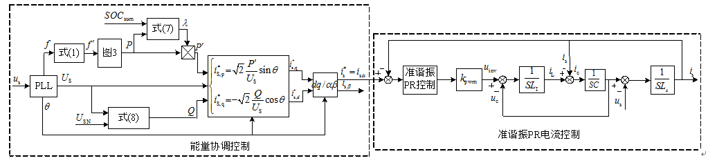 綜上所述,可得基于下垂控制的PSU能量協(xié)調(diào)控制結(jié)構(gòu)圖如圖4所示,主要包括能量協(xié)調(diào)控制和準(zhǔn)諧振PR電流控制兩部分。其中us為混合微電網(wǎng)各相的相電壓,PLL為單相鎖相環(huán),相電壓經(jīng)過PLL后可得到相電壓的相角θ和幅值US。通過能量協(xié)調(diào)控制可以獲得電流內(nèi)環(huán)的指令電流i*s,再利用準(zhǔn)諧振PR電流控制對指令電流進行跟蹤控制。