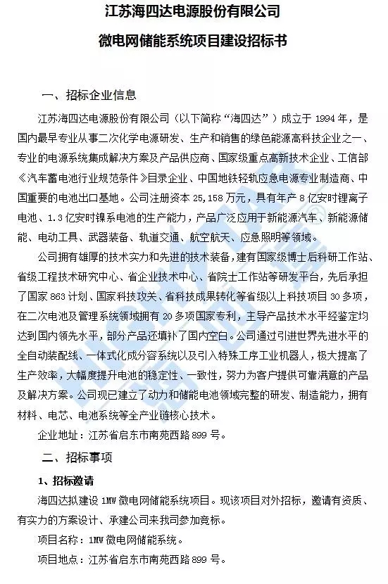 中國(guó)儲(chǔ)能網(wǎng)訊:海四達(dá)擬建設(shè)1MW微電網(wǎng)儲(chǔ)能系統(tǒng)項(xiàng)目。現(xiàn)該項(xiàng)目對(duì)外招標(biāo),邀請(qǐng)有資質(zhì)、有實(shí)力的方案設(shè)計(jì)、承建公司來(lái)我司參加競(jìng)標(biāo)。
