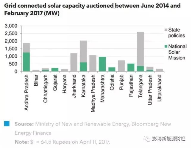印度的光伏價格正在持續(xù)下降。2016年的最低光伏電價為每度電4.34盧比(折合$64.1perMWh)。2017年2月,光伏電價繼續(xù)下跌至每度電3.31盧比(折合$49.38perMWh)。2017年4月11日,Engie公司甚至創(chuàng)下了每度電3.15盧比(折合$48.48perMWh)的光伏電價新低。
