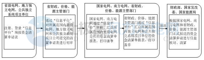 2、各省(區(qū)、市)財(cái)政、價(jià)格、能源主管部門負(fù)責(zé)通過信息平臺對轄區(qū)內(nèi)不屬于國家電網(wǎng)公司、南方電網(wǎng)公司的地方獨(dú)立電網(wǎng)企業(yè)以及公共獨(dú)立系統(tǒng)項(xiàng)目單位填報(bào)的資金清算申請表及證明材料復(fù)審、匯總、打印蓋章后行文上報(bào)財(cái)政部、國家發(fā)展改革委和國家能源局。
