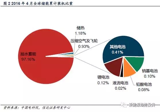 截至2016年4月,全球儲(chǔ)能總裝機(jī)容量為145.92吉瓦,其中抽水蓄能為142吉瓦,占全部裝機(jī)容量的97.16%,化學(xué)電池儲(chǔ)能只占了總裝機(jī)容量的不到1%。