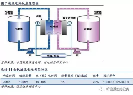 液流電池是以具有流動(dòng)性的電解質(zhì)溶液作為活性物質(zhì)的電池,活性物質(zhì)分裝在兩個(gè)儲(chǔ)液罐中,各由一個(gè)泵使溶液流經(jīng)液流電池電堆,在離子交換膜兩側(cè)的電極上分別發(fā)生氧化和還原反應(yīng)。其最大的特點(diǎn)在于輸出功率和儲(chǔ)能容量相互獨(dú)立,其功率的大小取決于電堆,而容量大小取決于電解液容量。液流電池研究體系包括:多硫化鈉/溴體系、全釩體系、鋅/溴體系和鐵/鉻體系等,目前全釩液流電池是液流電池中發(fā)展最快的,技術(shù)也是最成熟的,其特點(diǎn)是循環(huán)壽命長(zhǎng)、安全性高、充放電效率可達(dá)70%,系統(tǒng)響應(yīng)時(shí)間在20毫秒左右,工作溫度為5℃~45℃。但是全釩液流電池的溶液有毒性、不環(huán)保、放電倍率低、能量密度低、電池制造成本相對(duì)較高(3000元/kWh以上),目前全釩液流電池還處于項(xiàng)目示范階段,距離商業(yè)化還需一段時(shí)間。