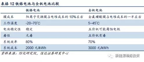 與全釩電池相比,鐵鉻電池有其獨(dú)到的優(yōu)勢(shì),其中陽(yáng)離子交換膜成本低是其最突出的特點(diǎn),相比全釩電池的膜成本占電堆成本的約1/2,鐵鉻電池的膜成本只占電堆成本的10%。同時(shí)工作溫度廣,電池更穩(wěn)定。目前已有公司可以將鐵鉻電池系統(tǒng)成本降到2000元/kWh以下,有一定成本優(yōu)勢(shì),但是由于尚未規(guī)模化應(yīng)用,技術(shù)有效性尚需進(jìn)行實(shí)際驗(yàn)證。