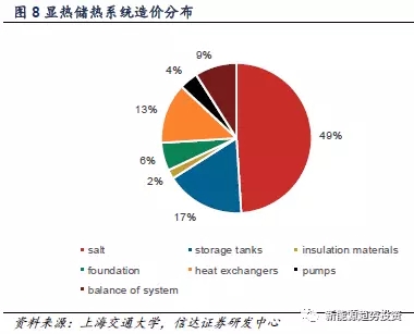 顯熱儲(chǔ)熱是利用材料所固有的熱熔進(jìn)行的熱量?jī)?chǔ)存形式,其特點(diǎn)是鹽成本占總成本的近一半,而儲(chǔ)熱密度低(0.2GJ/m3),顯熱儲(chǔ)熱的研究時(shí)間最長(zhǎng),成本相對(duì)較低,在國(guó)外也有少量商業(yè)化應(yīng)用,但是國(guó)內(nèi)由于起步晚,還未進(jìn)入大規(guī)模商業(yè)化運(yùn)行階段,實(shí)際上光熱發(fā)電中使用的熔融鹽以及太陽(yáng)能熱水器其本質(zhì)就是顯熱儲(chǔ)熱。