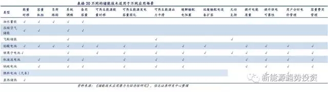 我們將各種儲(chǔ)能技術(shù)根據(jù)其不同的特性與應(yīng)用場(chǎng)景的需求進(jìn)行配對(duì),得到不同儲(chǔ)能技術(shù)最適用的應(yīng)用場(chǎng)景,隨著技術(shù)的進(jìn)步,儲(chǔ)能技術(shù)能適用的場(chǎng)景也會(huì)發(fā)生改變。如飛輪儲(chǔ)能分為能量型和功率型,能量型飛輪儲(chǔ)能目前放電時(shí)間還較短,實(shí)際應(yīng)用價(jià)值不高,但是如果放電時(shí)間可以提升到時(shí)分級(jí),則能量型飛輪儲(chǔ)能也能在可再生能源出力平滑等應(yīng)用場(chǎng)景中有一席之地。