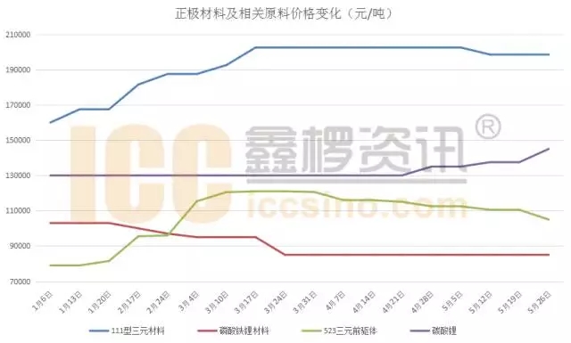 本周三元材料市場(chǎng)較為穩(wěn)定,主流報(bào)價(jià)18萬(wàn)/噸左右,有部分廠家價(jià)格略有下調(diào)。大型企業(yè)表示銷量很好,在生產(chǎn)方面,基本是滿產(chǎn)生產(chǎn),寧波某企業(yè)表示每月都在擴(kuò)產(chǎn),也有企業(yè)表明準(zhǔn)備在六月份擴(kuò)大生產(chǎn)。可以看出,三元市場(chǎng)依舊很火,沒(méi)有因?yàn)樵牧蟽r(jià)格的變動(dòng)而影響生產(chǎn)。