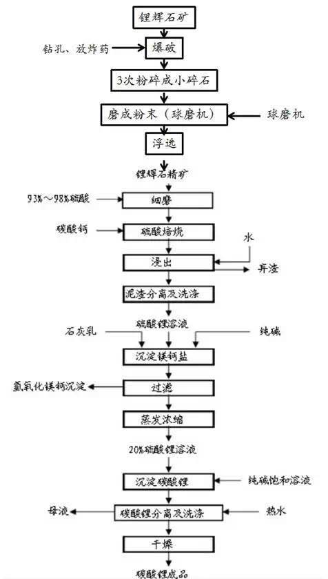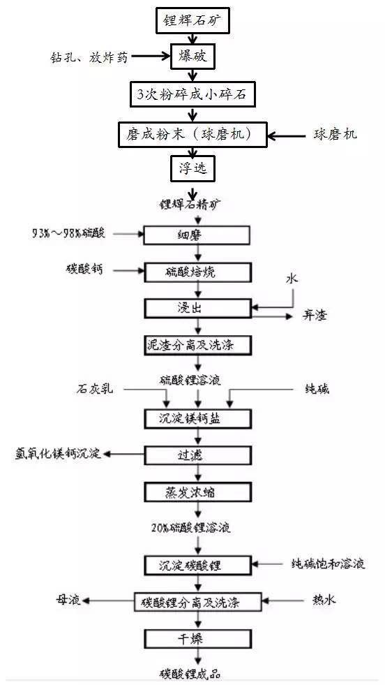 (2)鋰礦提鋰輝石,采用洞采的方法,提取出鋰輝石,再使用硫酸法等方法得到碳酸鋰。