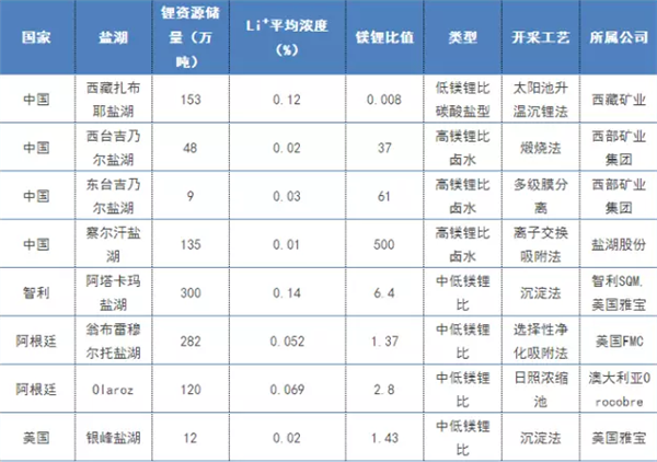 西藏礦業(yè)、西部礦業(yè)集團(tuán)、鹽湖股份、SQM、FMC和美國(guó)雅寶等公司掌握著全球著名的鹽湖,不同鹽湖,鎂鋰比值也有很大的差別,運(yùn)用的開(kāi)采工藝也會(huì)“因湖而異”。下表是全球已開(kāi)發(fā)的著名鹽湖提鋰技術(shù)。