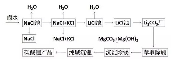 (1)鹽湖提鋰,主要是利用太陽(yáng)能將含鋰鹵水在蒸發(fā)池中自然蒸發(fā)、濃縮,析出碳酸鋰。