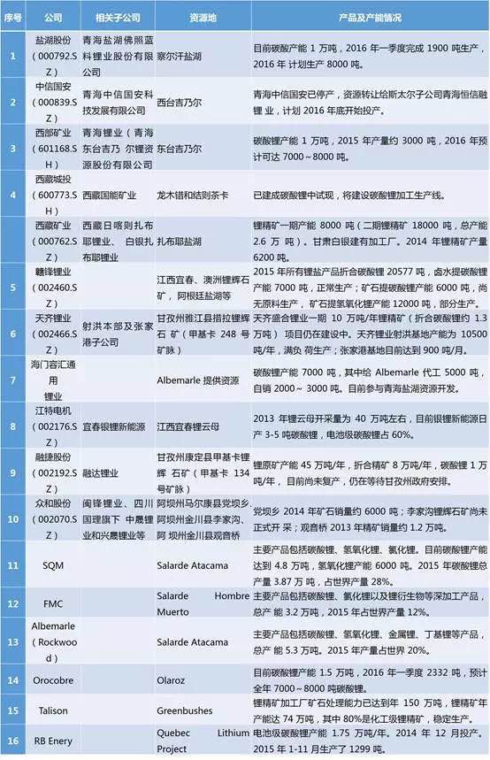 國(guó)內(nèi)外鋰業(yè)公司產(chǎn)能情況(截止2016年3月)