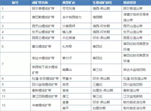 我國(guó)鋰礦成礦條件優(yōu)越,根據(jù)鋰礦成礦條件和成礦規(guī)律,全國(guó)劃分出松潘-甘孜、阿爾泰、藏北、柴達(dá)木等12個(gè)鋰礦成礦區(qū)帶。