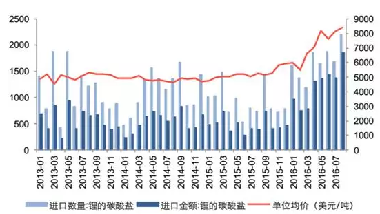 全球碳酸鋰需求量持續(xù)增長(zhǎng),進(jìn)口碳酸鋰單價(jià)持續(xù)上漲。從2016年的1月份到3月份,短短3個(gè)月,國(guó)內(nèi)碳酸鋰從4萬(wàn)漲到了十七八萬(wàn)。