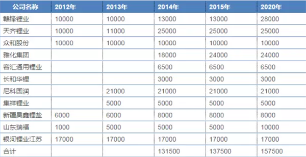 國(guó)內(nèi)外鋰業(yè)公司主要有鹽湖股份、中信國(guó)安、西部礦業(yè)、西藏城投、贛鋒鋰業(yè)、天齊鋰業(yè)、海門容匯通用、江特電機(jī)、融捷股份、眾和股份、SQM、FMC、Albemarle(Rockwood)、Orocobre、Talison和RBEnery。下表為這14家企業(yè)的鋰產(chǎn)能。