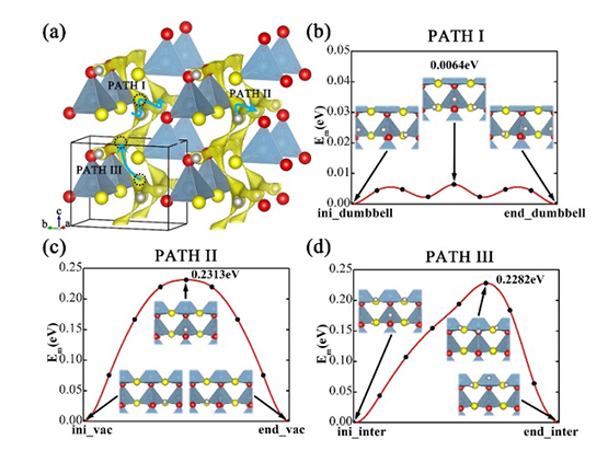 圖2計(jì)算得到的Pmc21-LiAlSO的動(dòng)力學(xué)性質(zhì)。(a)通過BVpath程序計(jì)算得到的LiAlSO中的鋰離子輸運(yùn)通道以及由密度泛函方法計(jì)算得到(b)Li+沿a方向由間隙離子與晶格位離子協(xié)同運(yùn)動(dòng)的遷移勢(shì)壘,(c)Li+沿a軸方向空位遷移的勢(shì)壘,(d)Li+沿c方向間隙離子遷移的勢(shì)壘。