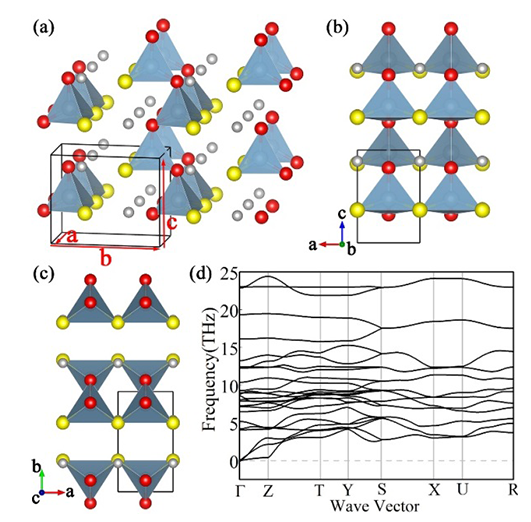 圖1通過計(jì)算預(yù)測(cè)得到的(a)Pmc21空間群LiAlSO的晶體結(jié)構(gòu),沿(b)b-軸和(c)c-軸的視圖以及(d)計(jì)算得到的聲子譜?;疑?、黃色和紅色的圓球分別代表Li,S和O原子。四面體代表AlS2O2單元。